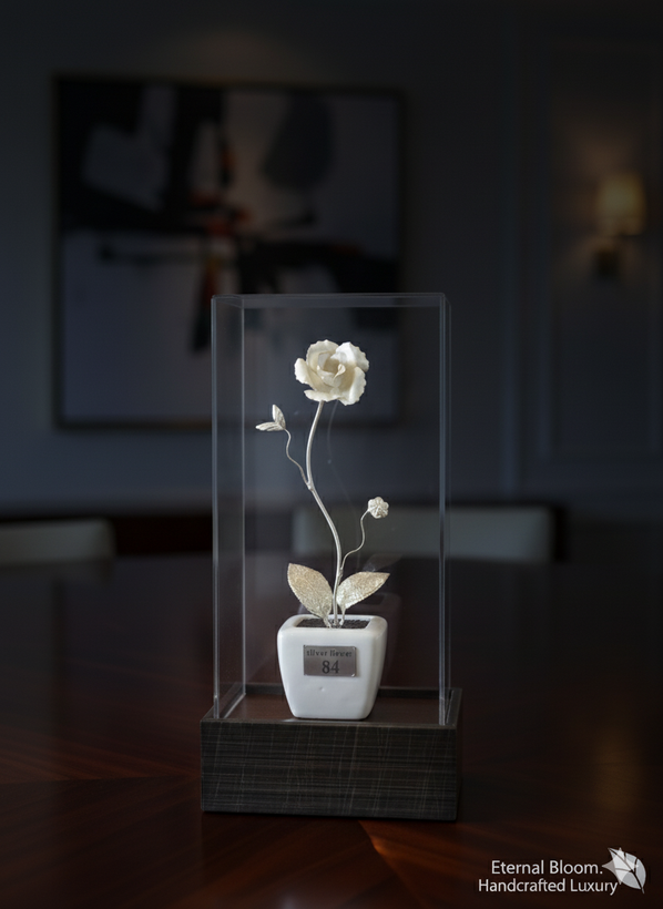 گل رز تمام نقره عیار ۸۴ ارتفاع باکس ۲۵ سانت همراه با باکس پلکسی وارداتی و کفی pvc
