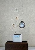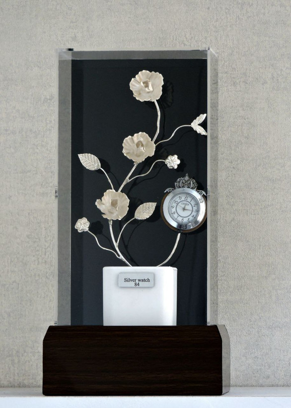 این محصول شامل یک گل رز نقرهای مینیاتوری به همراه ساعت رومیزی با کیفیت وارداتی است که در باکس پلکسی وارداتی قرار گرفته است.