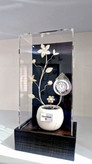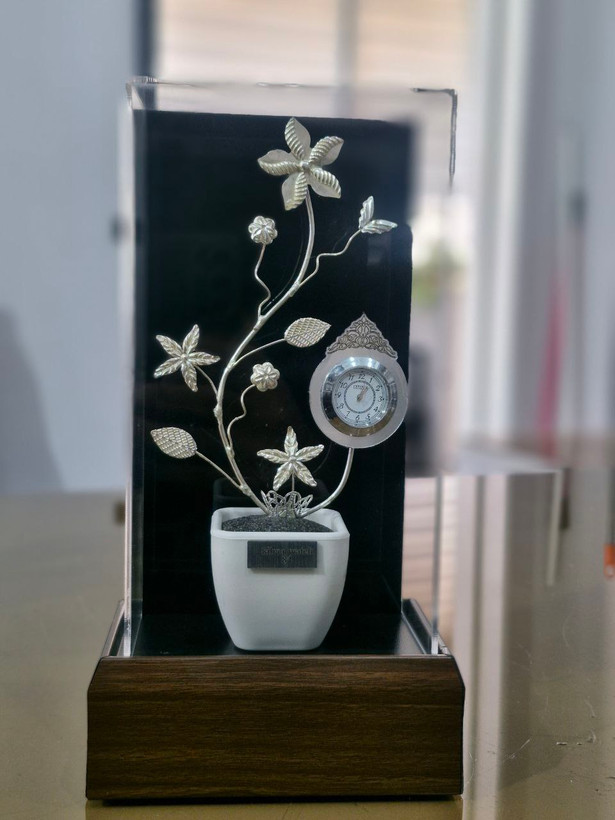 این محصول شامل یک ساعت رومیزی با طرح شکوفه ساخته شده از تمام نقره ۸۴ عیار است و در باکس پلکسی وارداتی با کف PVC قرار دارد.