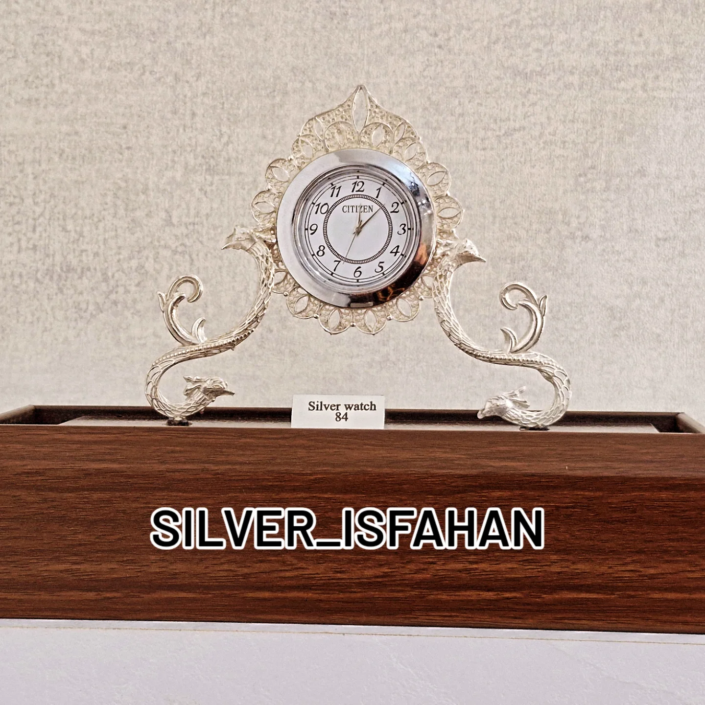 ساعت رومیزی تمام نقره، طرح سیمرغ ،عیار استاندارد ۸۴ همراه با باکس پلکسی وارداتی پایه فلزی و پایه pvc هر دو مدل پایه قابل سفارش